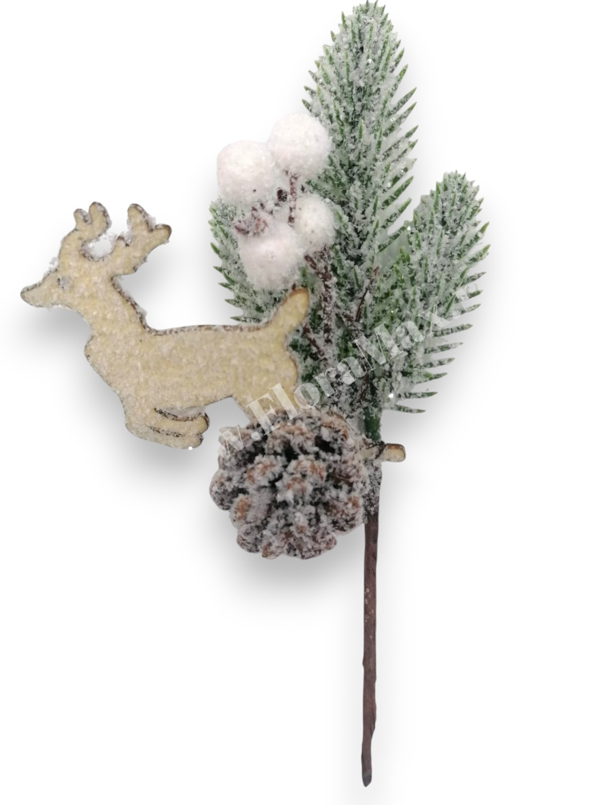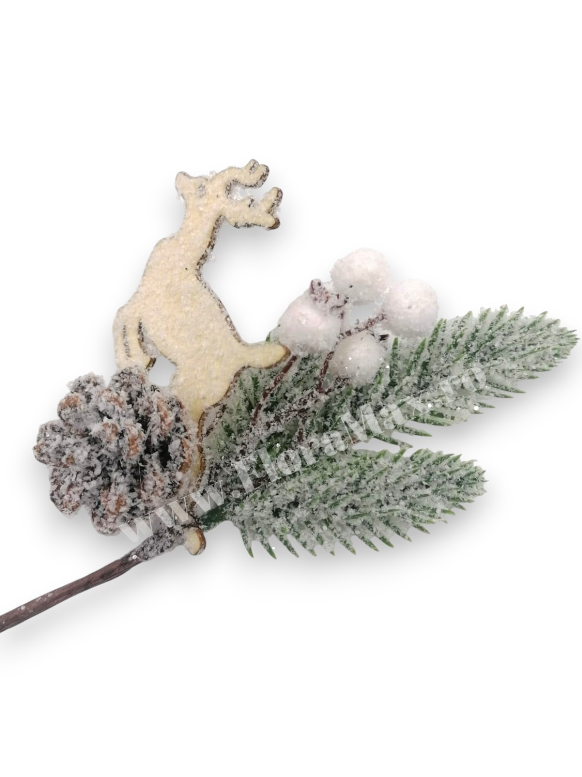 Crenguta brad artificial ninsa pentru aranjamente Craciun cu bilute albe Cerb alb con brad si sclipici