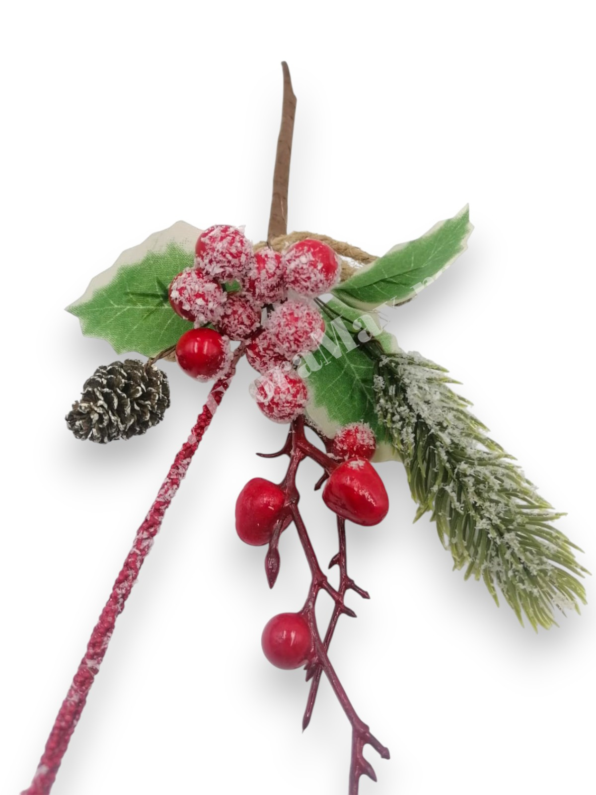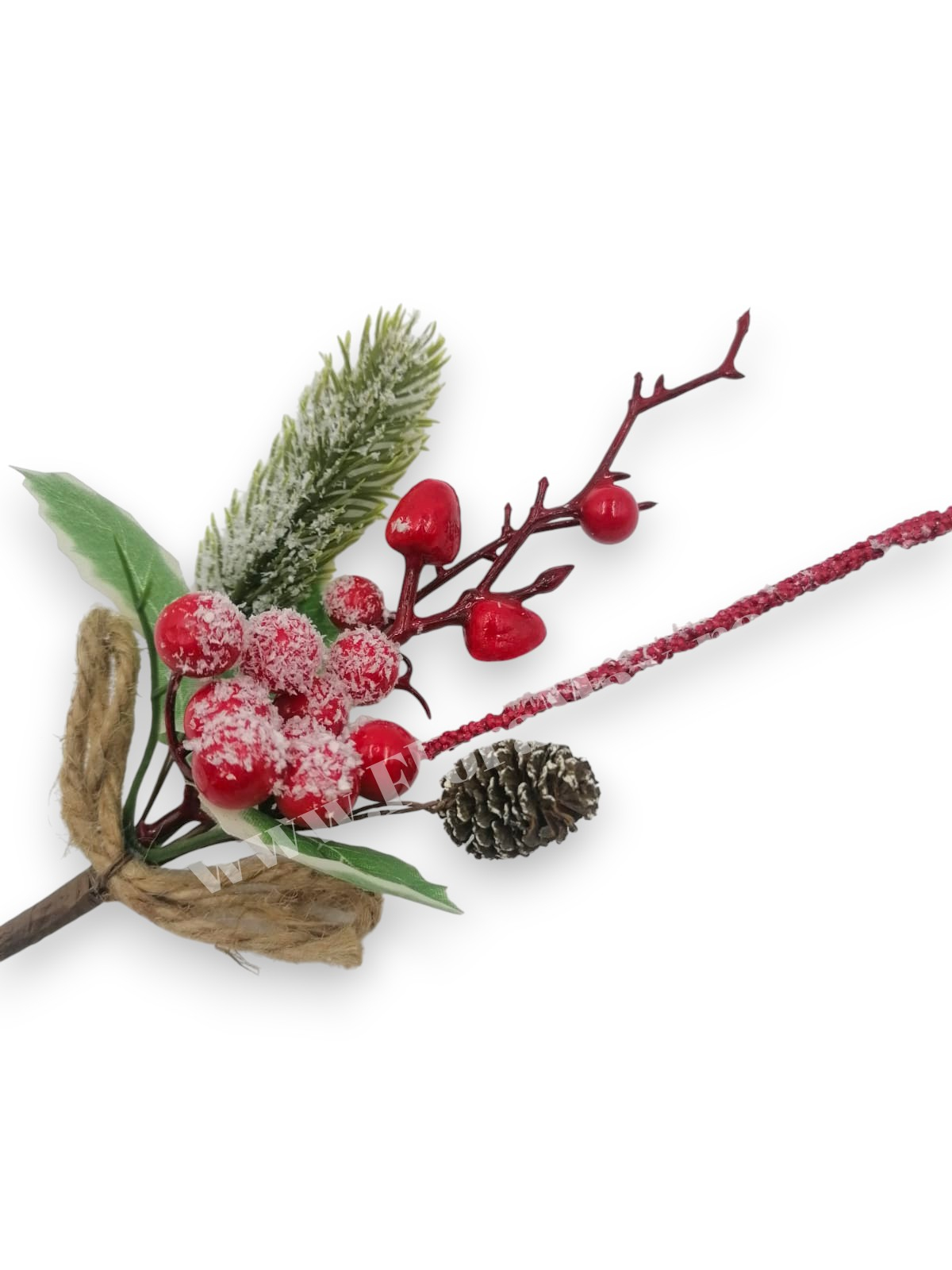 Crenguta brad artificial ninsa pentru aranjamente Craciun cu bilute rosii con brad si sclipici 26 cm