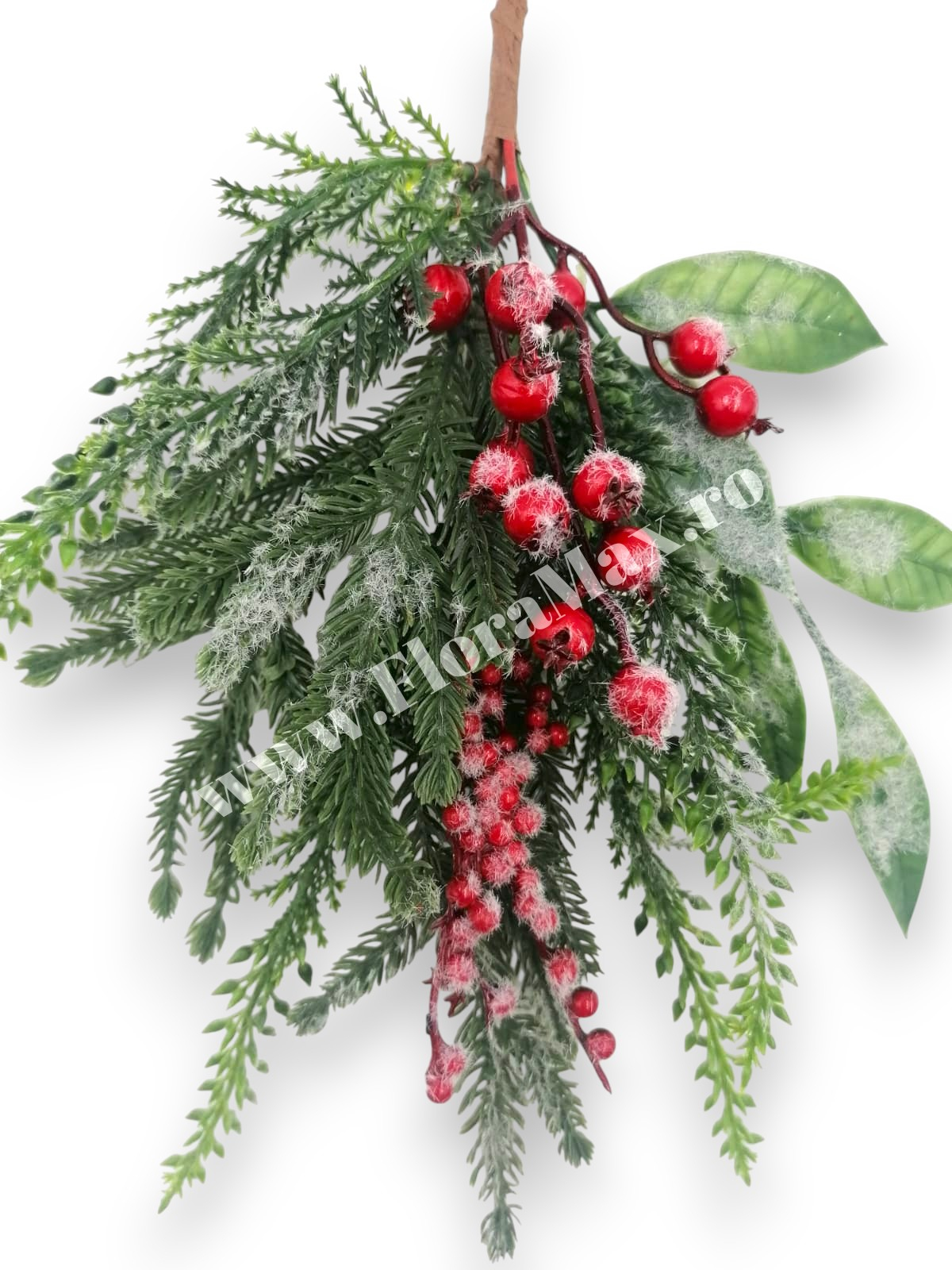 Crenguta brad artificial ninsa pentru aranjamente Craciun cu bilute rosii ilex  si sclipici