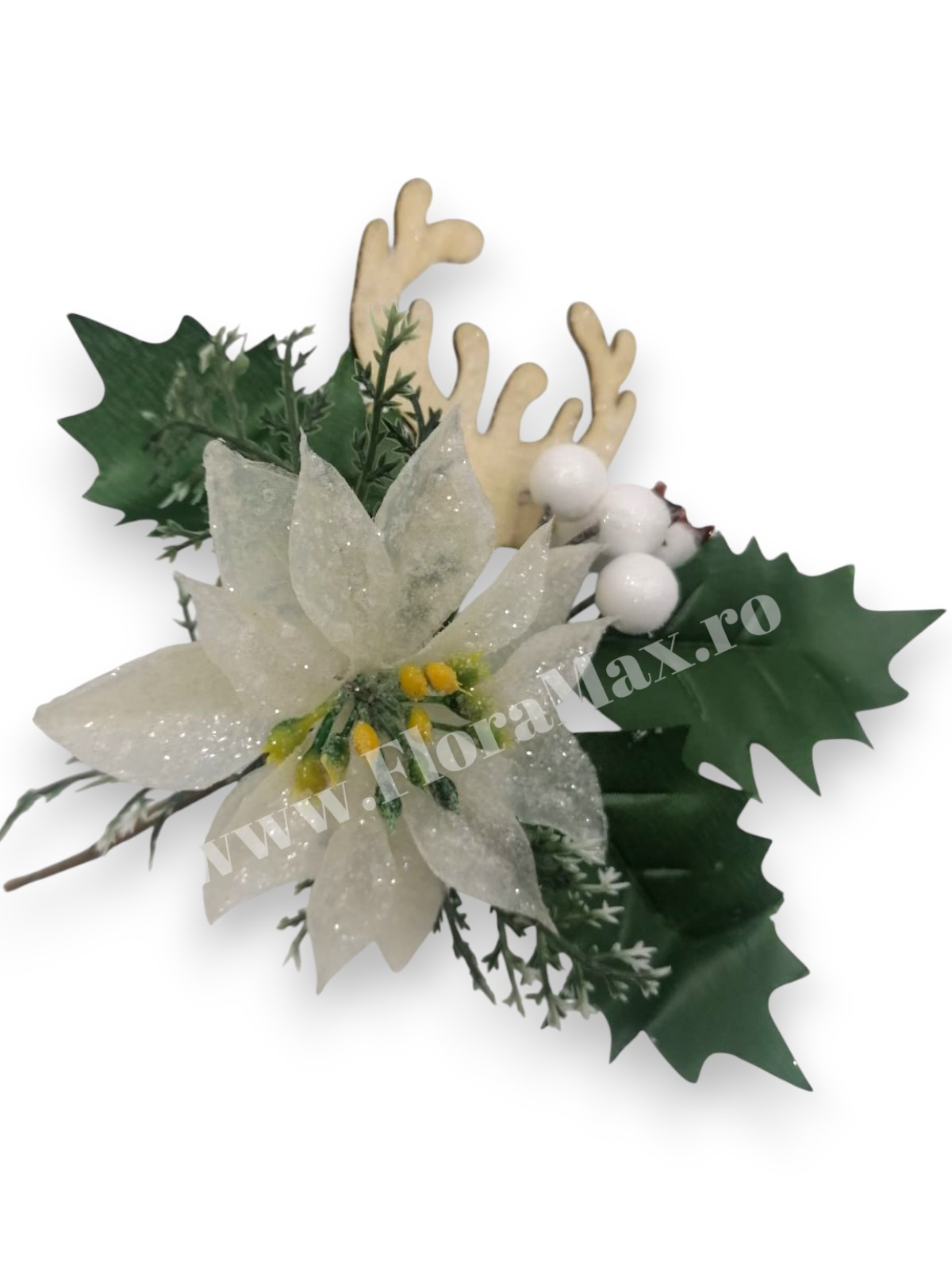 Crenguta brad artificial pentru aranjamente Craciun cu bilute albe coarne si craciunita alba 17 cm