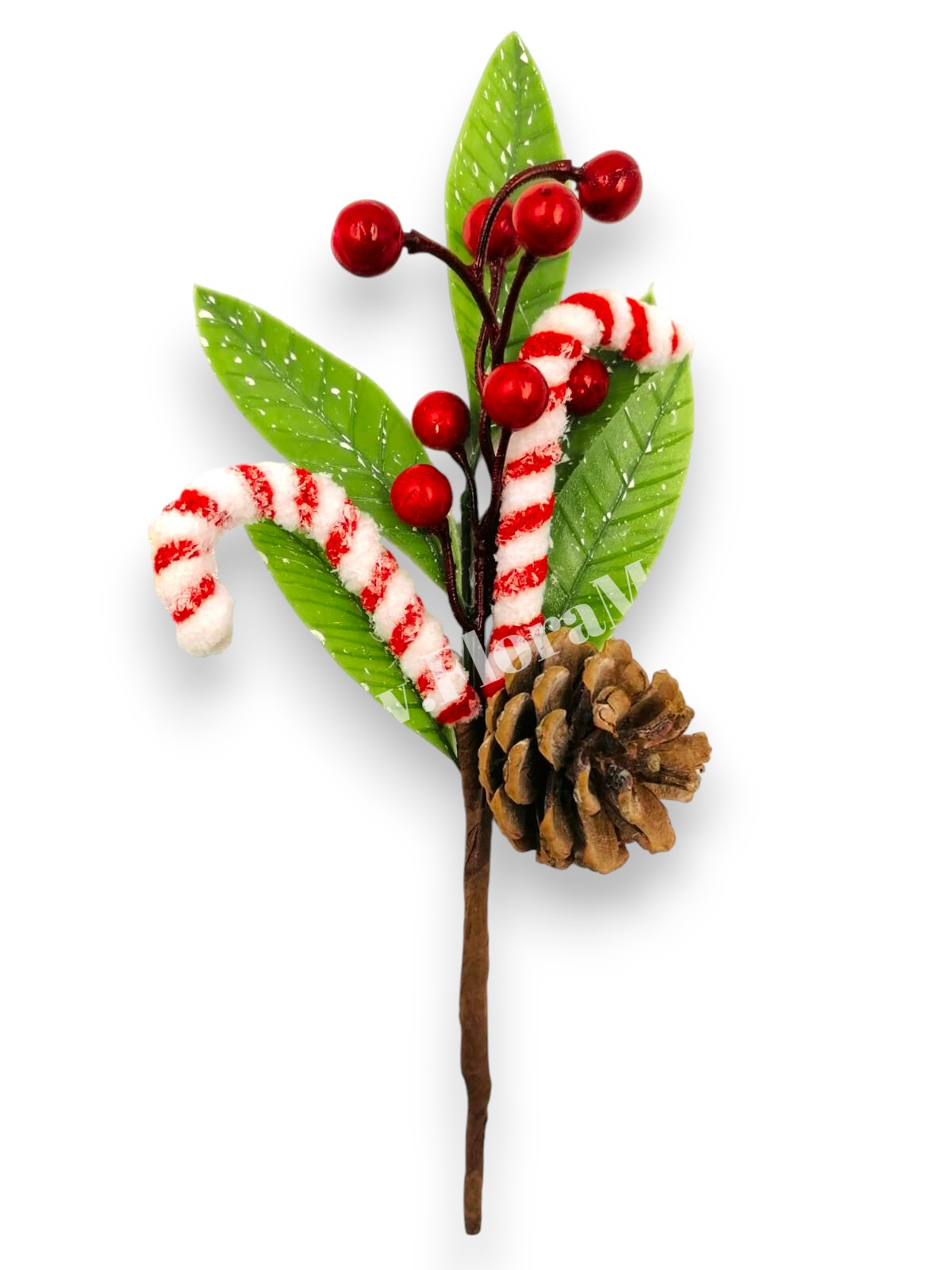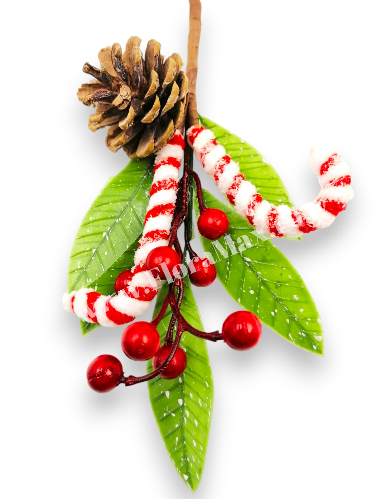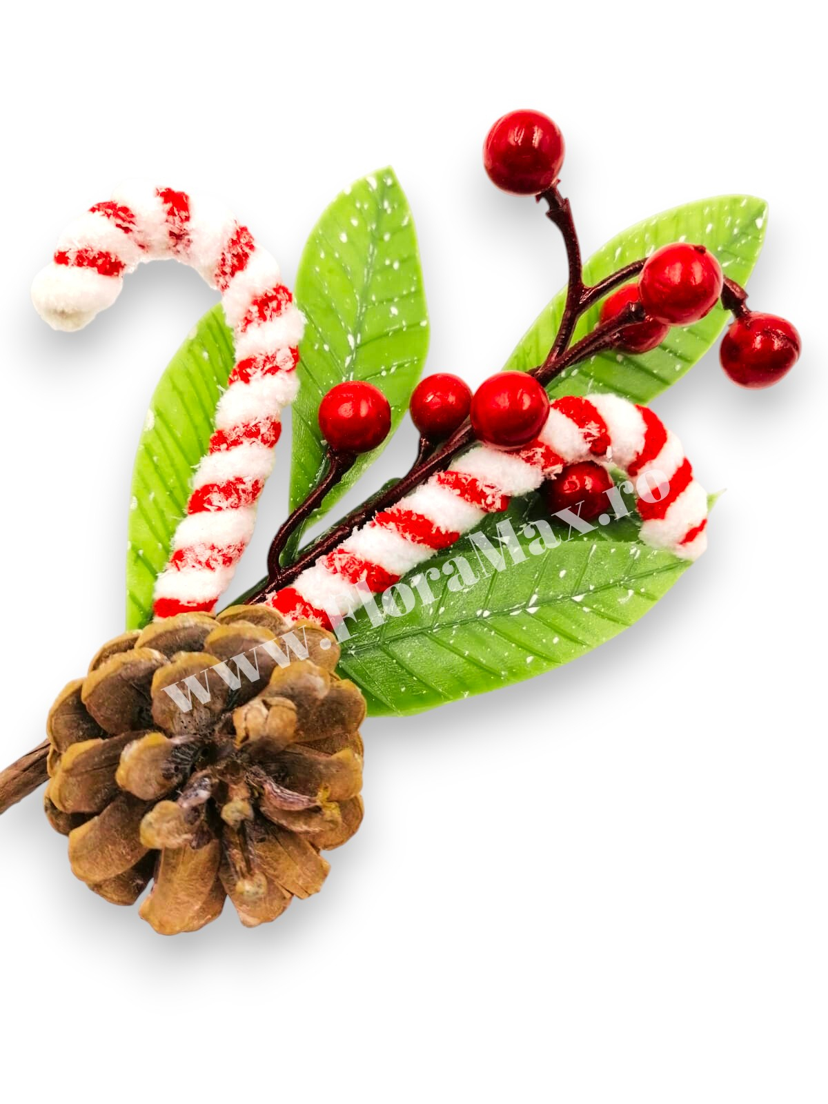 Crenguta festiva cu bastonase rosii, bile si con de brad, perfecta pentru coronite, buchete sau decoratiuni de Craciun. Adauga magie aranjamentelor tale!