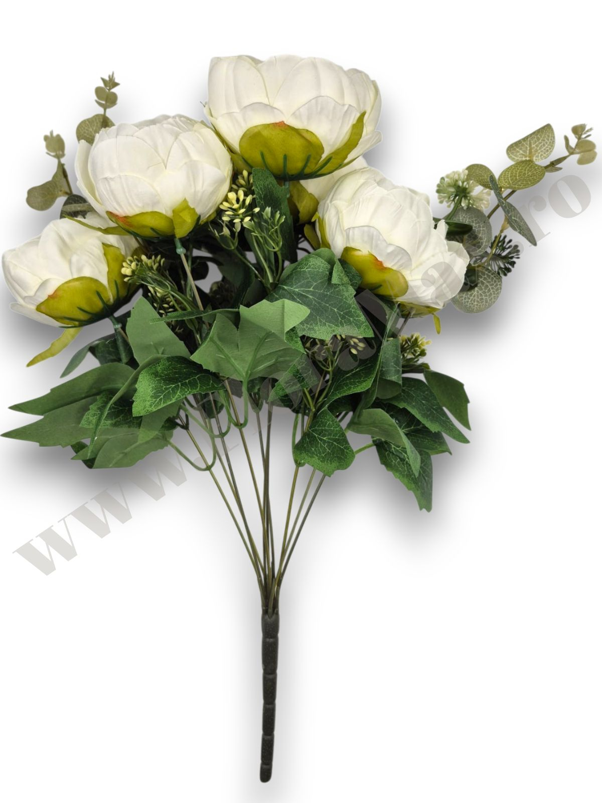 Componenta bogata: Buchet format din 10 fire (7 bujori mari, complet infloriti si 3 ramuri de verdeata decorativa tip eucalipt).