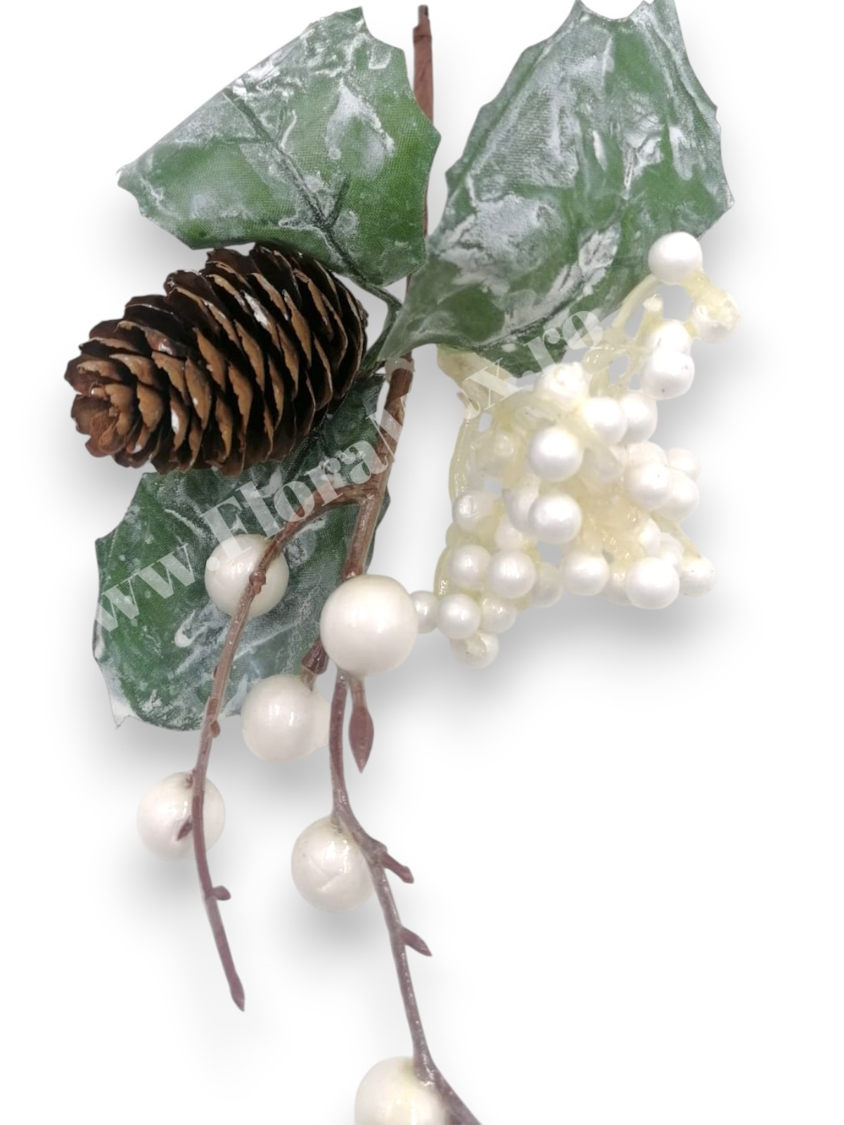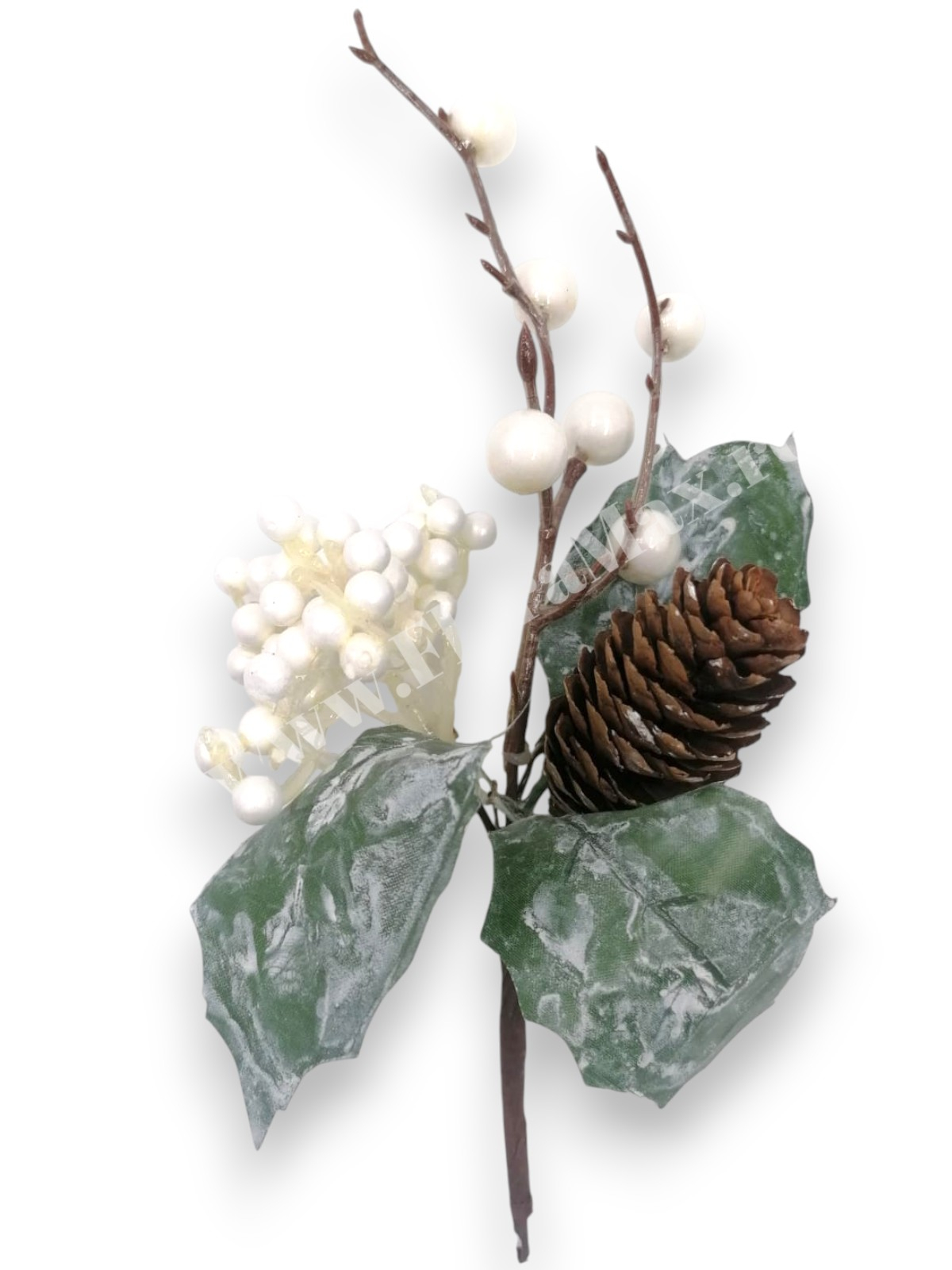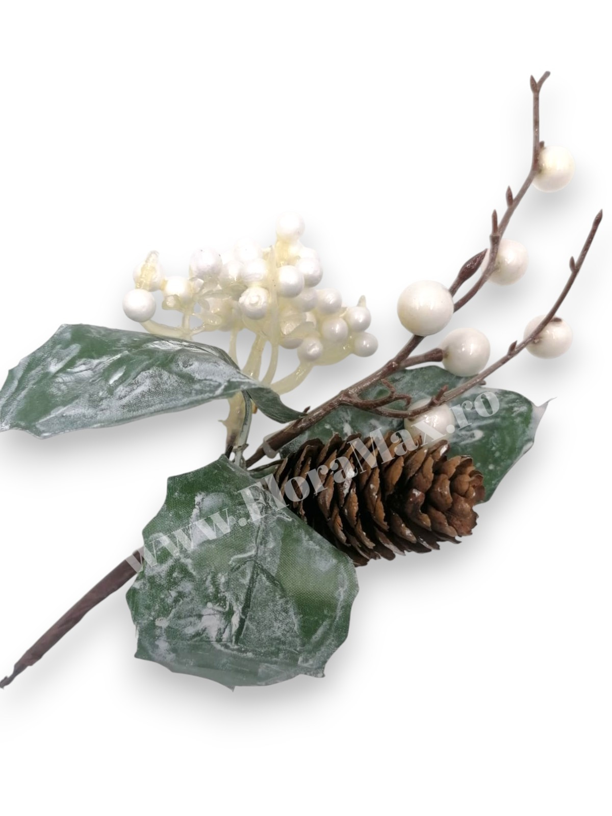 Crenguta brad artificial ninsa pentru aranjamente Craciun cu bilute albe si con brad 23 cm