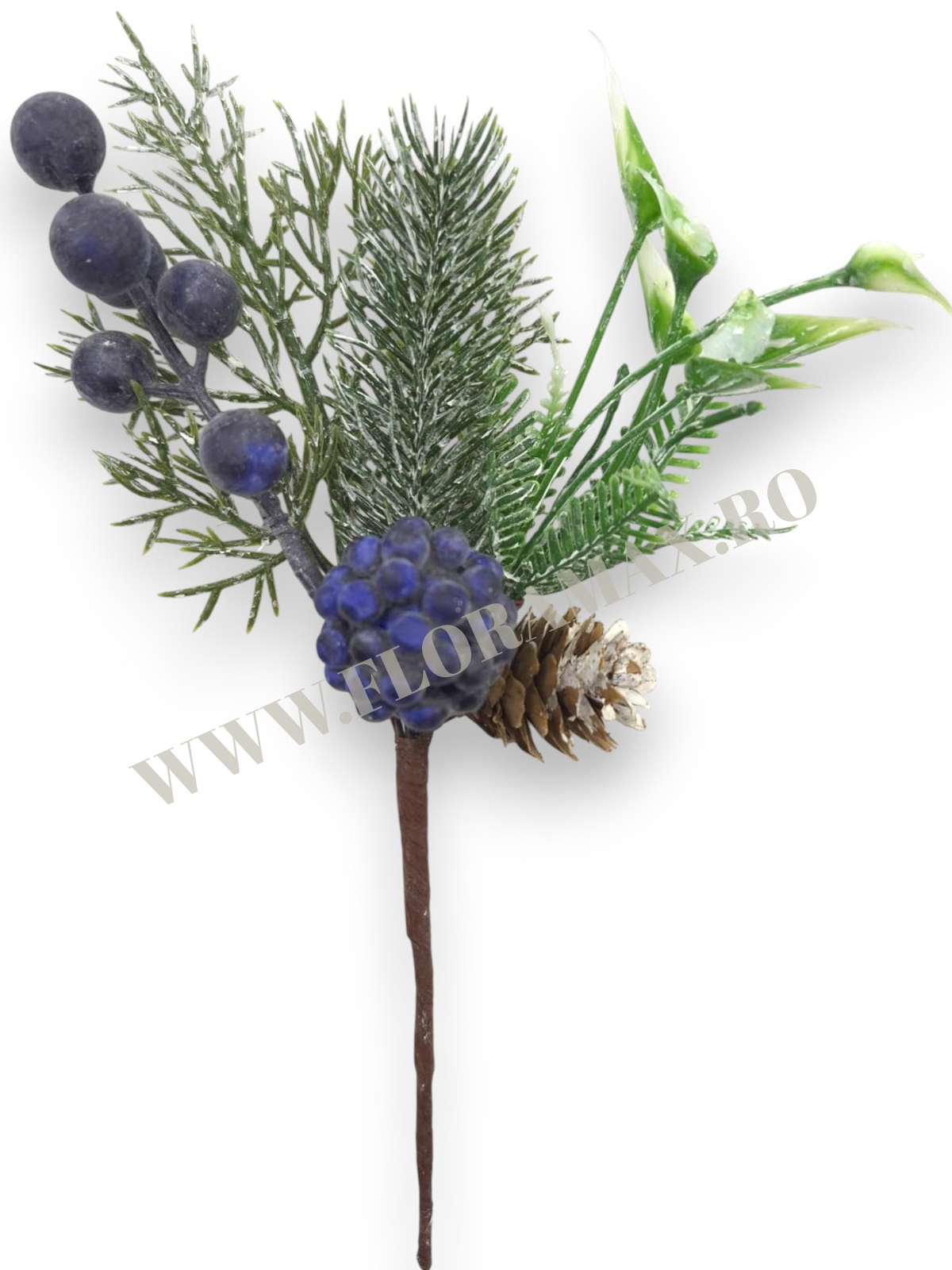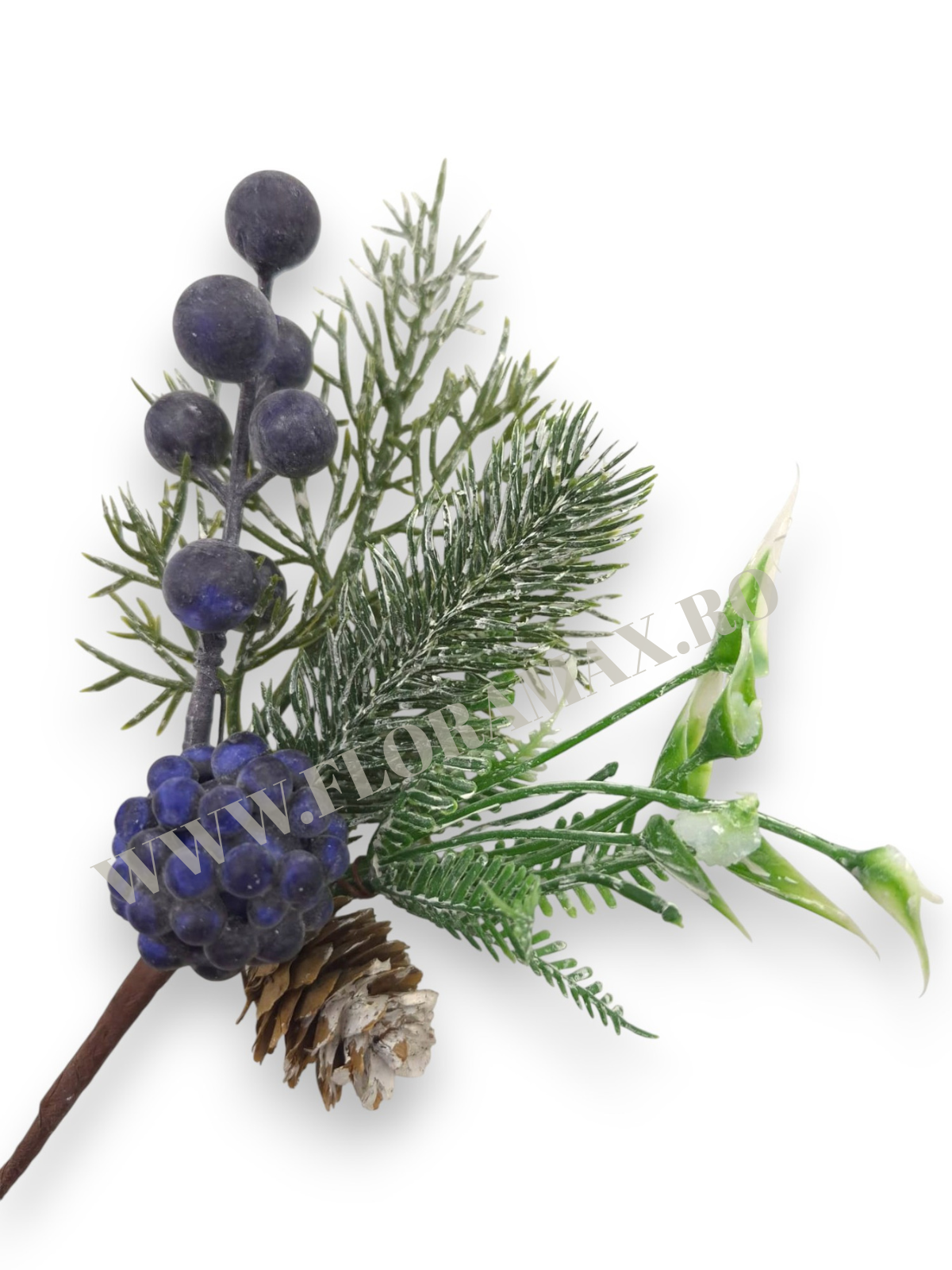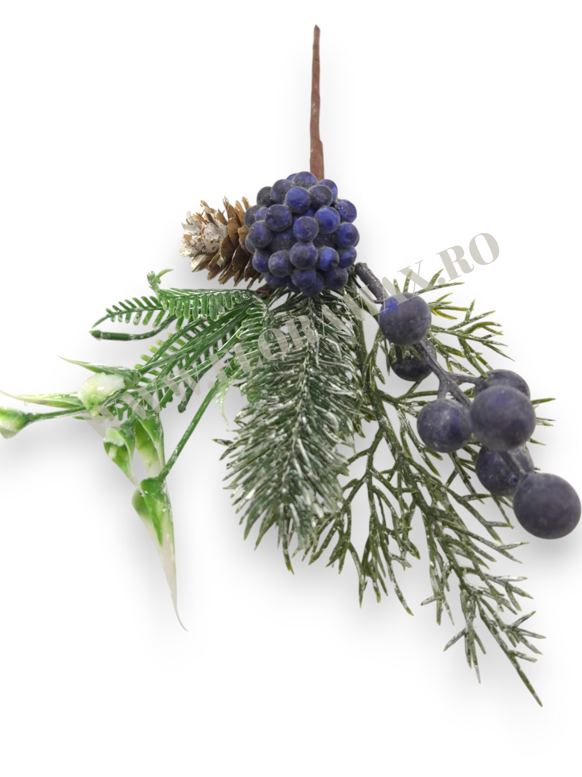 Crenguta brad artificial pentru aranjamente Craciun cu bilute mov si con brad 27 cm - Copie