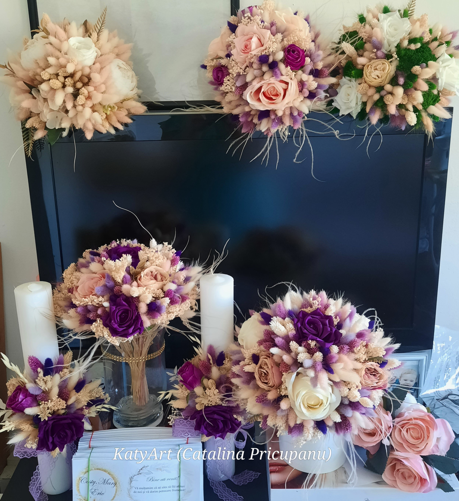 Florile uscate pot fi folosite pentru a crea buchete de mireasa, buchete pentru domnisoare de onoare, aranjamente pentru mese sau aranjamente pentru locatii , ornare cu flori uscate lumanari de nunta sau ornare cu flori uscare lumanari de botez.